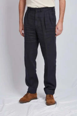 This style and cut was inspired by the military suit pant. It features real horn buttons, a high waist position, a tapered leg and reverse double pleats.
