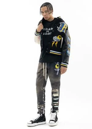 Model is 6 (183 cm), 125 pounds (56 kg), usually wears M in tops. A size 29 in denim and 46 in trousers. Size 10 in shoes.