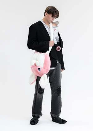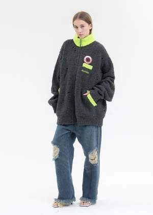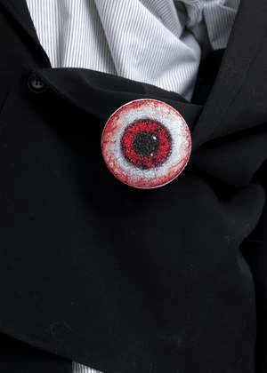 Embroidered eyeball badge in red, from Doublet. Features a fully embroidered multicoloured face. Silver-tone safety-pin fastening at the rear.