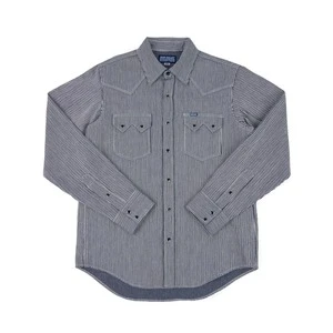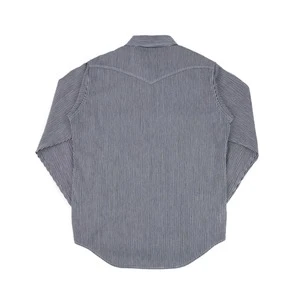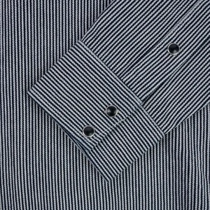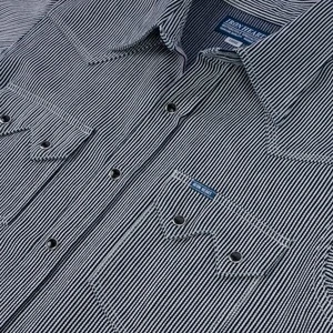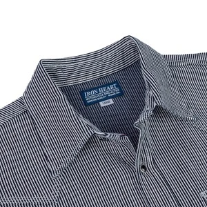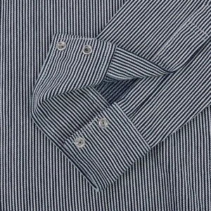With origins in the rail road industry, hickory stripes is a hard-wearing fabric, whose indigo stripes help to disguise oil stains. Iron Heart presents their Sawtooth Western cut in an 8 ounce herringbone hickory fabric, woven using a dobby loom to create additional texture and character. With a white weft and an indigo dyed warp, we expect this to fade quickly and quite beautifully.