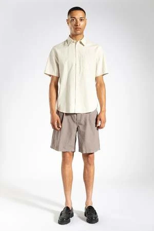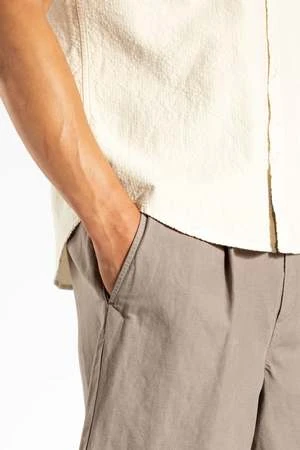 The Christopher Cotton Linen short is a pleated style, constructed from a textured cotton linen cloth. These shorts sit slightly higher on the waist and finish just above the knee with a wider leg. Finished with back flap pockets and french bearer fly.