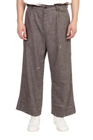 Peng Tai creates modern silhouette with traditional chinese philosophy. Inspired by how Chinese herbal medicine regulates the body from the inside out, Peng Tai aims to research and develop a way to boil Chinese herbal medicine with fabrics, to create clothes that feel like a second skin as seen with the Distressed SL Trousers.