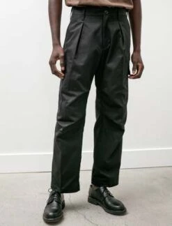 A relaxed fitting, elevated take on a classic six pocket cargo pant cut from a deep black, cotton gabardine with a subtle lustre. Front features a single one inch pleat at the waist line with a crease running to hem, and three half inch pleats at each knee. Patch pockets at side and back are reinforced with internal cotton twill tape for a super strong hold; back pockets feature darted corners for added carrying capacity. Waistline features six belt loops for a strong hold, zip fly with horn button closure.