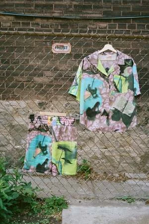 Unisex boxing shorts with an elasticized waistband. Developed out of quarantine fantasy, dreams of leopard printed hotel room floors inspired this print showing a scene with a spilled martini turned into a palm tree reflected pool, marabou slippers, a chartreuse LC2 chair, heart of Jesus plant, and an open book of poetry that reads: