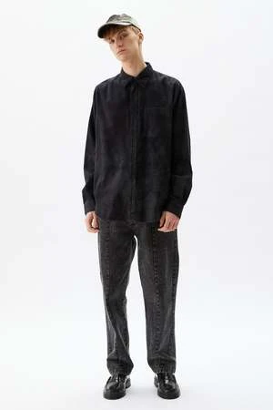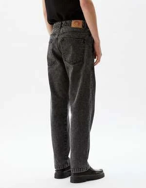 Stone washed denim trouser with a slight dropped crotch, slanted side pockets at front with two patch pockets and a yoke at back. The garment features a center front seam, deep hems and a straight leg. Each pair has a unique handwritten denim label. The fabric is 100% organic cotton and the buttons our branded denim ones.