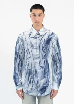 Relaxed compact print shirt in light blue, from Y-Project. Features a paneled construction with a spread collar, a scooped hem, left-chest pocket, and buttoned cuffs. Scrunched shirt all-over print. Finished with button closure, tonal stitching, and small logo print at the left chest.